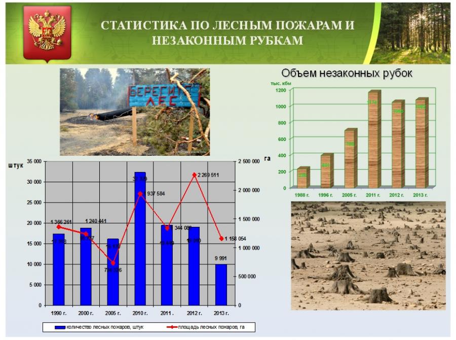 Согласно анализу статистической отчетности за период с 1990 по 2013 годы в лесах, расположенных на землях лесного фонда, было зарегистрировано более полумиллиона лесных пожаров, огнем пройдено около 30 млн. га лесных земель.