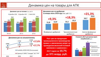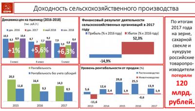 Здесь мы наблюдаем вопиющую ситуацию. За прошлый год в связи с падением цен на сельхозпродукцию наши крестьяне только по трем культурам потеряли 120 миллиардов рублей – почти половину из тех 250-ти миллиардов, которые выделяются в бюджете на поддержку всего АПК.