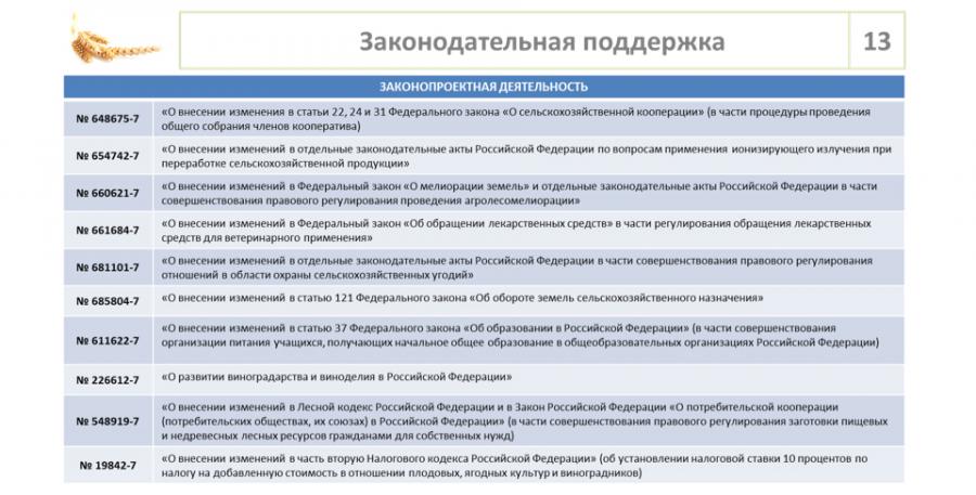 обработке сельхозпродукции, и многие другие. Целый перечень законодательных