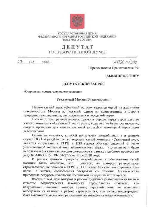Кроме того, депутат потребовал от Правительства дать поручение об организации работ по внесению границ парка, установленных в 1988, 1989 и 1992 году, в ЕГРН и ПЗЗ города Москвы, таким образом, закрепив их юридически.