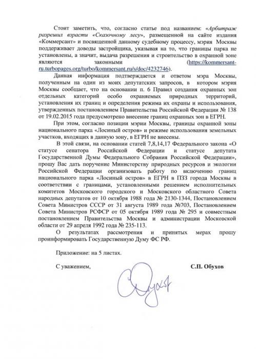 Во избежание дальнейших подобных фокусов со стороны мэрии и девелоперов депутат Сергей Обухов направил запрос в Правительство Российской Федерации, в котором призвал пресечь преступную схему «строительной приватизации» территории национального парка.
