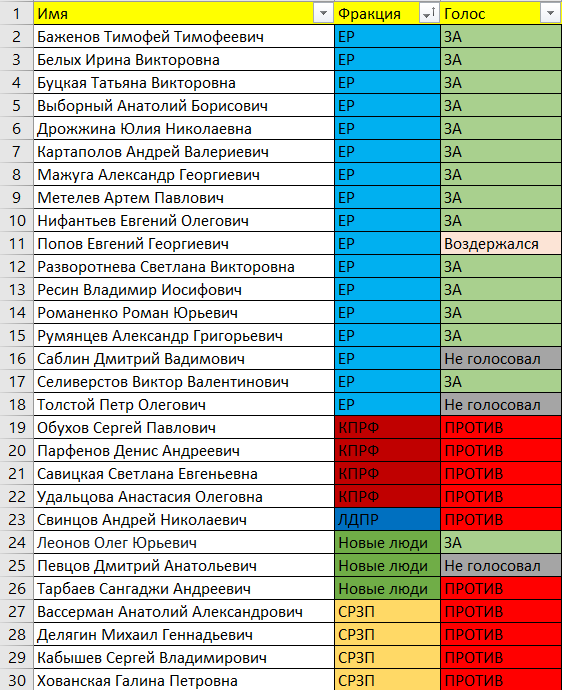 А сейчас привожу результаты голосования по этому законопроекту всех депутатов Госдумы, избранных от Москвы. Из московских единороссов только 3 депутата НЕ проголосовали ЗА: Е.Г. Попов (воздержался), Д.В. Саблин и П.О. Толстой (оба - не голосовали).
