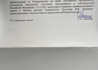 В ходе долгих переписок и проведений проверок прокуратурами различных уровней, депутату Госдумы от КПРФ Владимиру Исакову пришёл ответ, в котором сказано, что территорию Академии застраивать не будут. Если кратко, то: все земли Академии пока остаются на месте, Академия не имеет права сама распоряжаться этими территориями и заключать договоры, так как они относятся к Росимуществу. Со слов прокуратуры у Росимущества, архитектуры Москвы нет планов на застройку. Пока. Ректора предостерегли о недопущении нарушений требований закона.