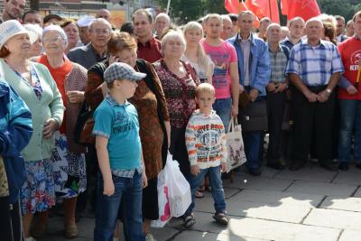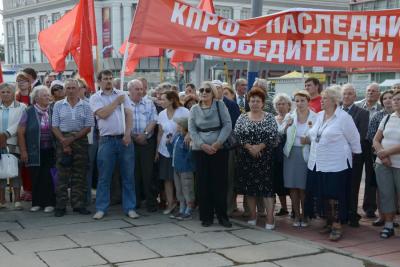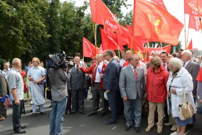 Во время митинга позади выступающих группа коммунистов держала транспарант, на котором было написано «Новый курс. Новые идеи. Новое правительство», а на фоне вечного огня развевалось Знамя Победы.
