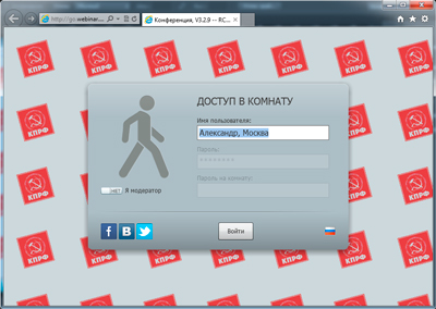 На открывшейся странице в окне «Доступ в комнату» в первое самое верхнее поле введите свои имя и фамилию, укажите через запятую Ваш регион. (Не переключайте кнопку «Я - модератор». Её значение должно быть – «нет». Два поля «Пароль» и «Пароль на комнату» будут неактивны для Вас!).