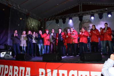 Вел концертную программу народный артист Республики Беларусь, художественный руководитель ансамбля "Сябры" Анатолий Ярмоленко. На нем была красная куртка с символикой КПРФ. Через всю сцену был растянут транспарант с надписью «За нами правда! Вместе победим!». С права и слева от сцены на больших экранах осуществлялась прямая трансляция митинга-концерта, так что происходящее можно было увидеть издалека.
