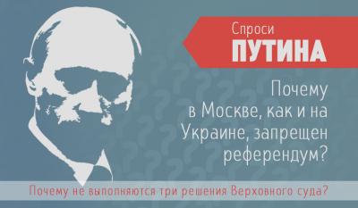 Пикетчики предлагают задать такой вопрос президенту. Поэтому мы говорим: Путин, ответь - будет ли референдум в Москве? Вообще, ответь: существует ли право в России? Закон в России действует или нет? Решение судов надо выполнять, или нет?