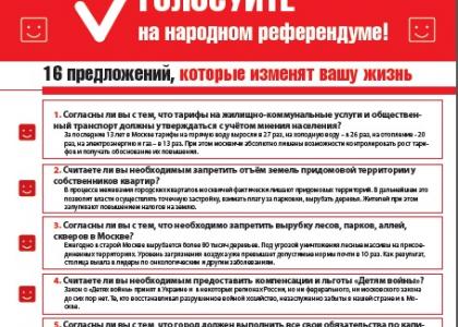 Поэтому не дожидаясь результатов правовой борьбы инициаторы предлагают москвичам высказать свое отношение к предлагаемым вопросам референдума. Уверены, что народный референдум, заставит власти москвы вынести на общегородское голосование 12 вопросов, решение москвичей по которым станет обязательным для властей.