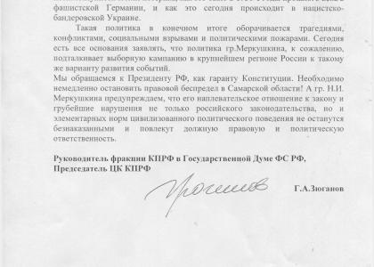 Мы обращаемся к Президенту РФ, как гаранту Конституции. Необходимо немедленно остановить правовой беспредел в Самарской области! А гр. Н.И. Меркушкина предупреждаем, что его наплевательское отношение к закону и грубейшие нарушения не только российского законодательства, но и элементарных норм цивилизованного политического поведения не останутся безнаказанными и повлекут должную правовую и политическую ответственность.