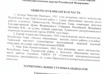 Избирательная комиссия зарегистрировала список кандидатов КПРФ в депутаты Верховного Хурала Республики Тыва.