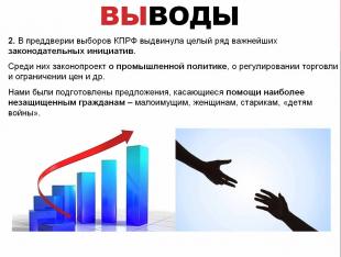 2) В преддверии выборов КПРФ выдвинула целый ряд важнейших законодательных инициатив. Среди них законопроект о промышленной политике, о регулировании торговли, об ограничении цен, о поддержке малого и среднего бизнеса. Нами были подготовлены предложения, касающиеся помощи наиболее незащищенным гражданам: малоимущим, женщинам, старикам, «детям войны». Была представлена и внешнеполитическая программа «Пять пунктов Зюганова по Новороссии». Она была материализована в активные и массовые действия по сбору гуманитарной помощи и крупные акции солидарности. Партия добивалась, чтобы в ходе избирательной кампании по всем этим темам состоялась полноценная дискуссия, но её навязать, в целом, не удалось.