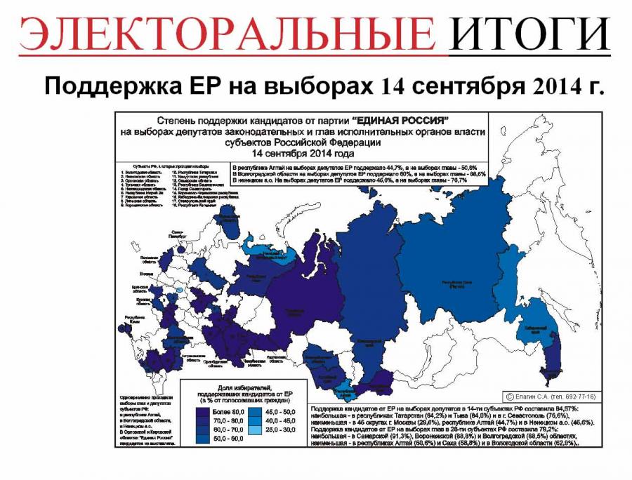 1) Общефедеральная региональная кампания 14 сентября проходила в условиях, когда страна ощутила на себе дыхание близкой войны, реальные санкции и нарастание вооруженных конфликтов по всему периметру нашей границы. Хотя и ослабла, но осталась на повышенном уровне победная эйфория «Крым наш!», всколыхнувшая патриотические чувства и мобилизовавшая значительную часть общества вокруг президента, по сути, выступающего в роли военного вождя, который приступил к возрождению чуть ли не СССР и воссоединению русского мира.