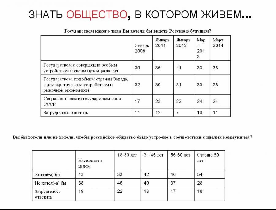 В политической жизни страны в чистом виде реализуется бонапартистский сценарий, когда нарастание внутриполитических противоречий купируется с помощью внешнеполитической экспансии. В русской истории уже были такие всплески в 1904 и 1914 гг., когда невиданный авторитет императора и всплеск патриотических чувств граждан после военных неудач обернулся против недавнего кумира. Естественно, анализ и прогноз развития ситуации вокруг Новороссии, Крыма, последствий санкций для дестабилизации внутриполитической ситуации не входит в задачи данного доклада.