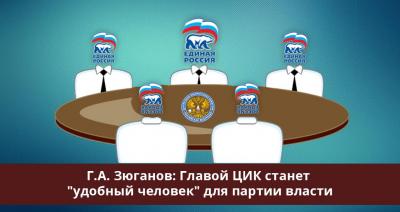 Главой Центризбиркома (ЦИК) изберут" удобного человека" для партии власти — "Единой России", считает руководитель КПРФ Геннадий Зюганов.