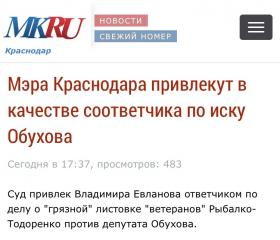 - В предварительном судебном заседании ответчик Рыбалко заявил, что текст листовки был подготовлен на заседании Совета по делам ветеранов при главе города, - сообщается на сайте Краснодарского городского отделения КПРФ. – Было сделано предположение, что Владимир Евланов согласовал текст листовок, в связи с чем мэр привлечен как председатель совета в качестве соответчика.