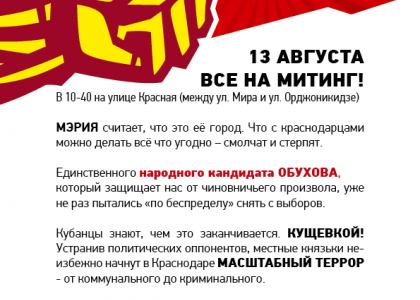 Шествие и митинг на Красной - против административного произвола на выборах и физического насилия в отношении представителей КПРФ. Среди требований участников протестной акции - прекращение административного давления на секретаря, члена Президиума ЦК КПРФ С.П. Обухова, других кандидатов-коммунистов, протест против физического насилия в отношении девяти ветеранов - участников пикетов против разрушительной и неэффективной политики мэрии Краснодара, поддержка справедливых требований различных инициативных групп жителей Краснодара.