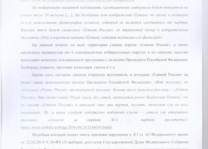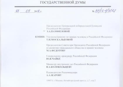 Депутаты Государственной Думы Валерий Рашкин и Сергей Обухов направили обращения председателю Центральной избирательной комиссии Элле Памфиловой, генпрокурору Юрию Чайке, министру внутренних дел Владимиру Колокольцеву с просьбой организовать проверку использования в агитации «Единой России», а также кандидатов в депутаты Государственной Думы цитат Владимира Путина, по результатам которой пресечь нарушения и привлечь виновных лиц к ответственности.