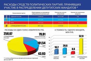 Исходя из объемов избирательных фондов, Центризбирком посчитал, сколько каждая из думских партий потратила на одного избирателя. Получилось, что самую эффективную с точки зрения бухгалтерии кампанию провели коммунисты. Им каждый голос достался по цене 43 рубля, а один мандат обошелся в 8,8 млн рублей. Самой неэффективной стала «Справедливая Россия»: при условной стоимости одного мандата в 52,9 млн рублей за каждый голос партия заплатила 258 рублей, то есть примерно в шесть раз больше, чем КПРФ. «Единой России» голоса и мандаты обошлись соответственно в 79 рублей и 16,2 млн рублей каждый. ЛДПР потратила на получение одного мандата 20,6 млн рублей, заплатив из предвыборного фонда по 101 рублю за каждый голос избирателя.