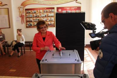 Ольга Николаевна Алимова первый секретарь Саратовского обкома КПРФ, кандидат на должность губернатора Саратовской области и лидер избирательного списка КПРФ проголосовала в гимназии № 1 (ул. Мичурина).