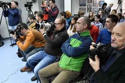 много журналистов, некоторым даже пришлось стоять в проходе. В