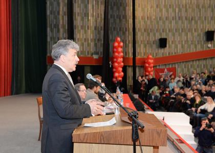 После выступления Павла Грудинина и его благодарностей в сторону новосибирцев, к микрофону вышел мэр Новосибирска Анатолий Локоть. Он обратился ко всем присутствующим, напомнив о 125-летие города в этом году, и вручил Павлу Грудинину памятный знак по случаю этого события.