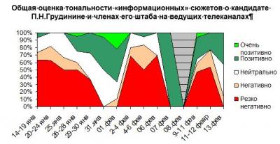 [2] Напоминаем, что критерий анализа состоит в следующем: сюжет считается «резко негативным», если в его рамках негативная информация о П.Н. Грудинине существенно превалирует над позитивной информацией о кандидате от КПРФ; «негативным», если такого рода информация превалирует над позитивной; «нейтральным» – если позитивная и негативная информация дается в равном объеме или сюжет ограничивается «технической» информацией о том или ином действии кандидата от КПРФ; «позитивным», если сюжет представляет собой, прежде всего, раскрытие программы кандидата от КПРФ или его содержательную и не «смонтированную» прямую речь; и «очень позитивным», если о кандидате от КПРФ сообщают исключительно привлекательную для избирателя информацию. Кроме того, при оценке того или сюжета использовалась качественная оценка его содержания, а также общий контекст освещения деятельности кандидата в Президенты РФ. Также в настоящем материале используется оценка «игнорирование», означающая сюжеты, в которых освещается деятельность иных кандидатов в Президенты РФ, но игнорируется активность П.Н. Грудинина и (или) его штаба и сторонников.