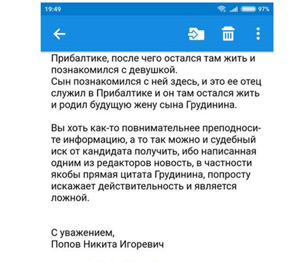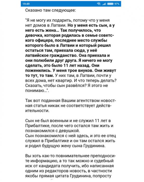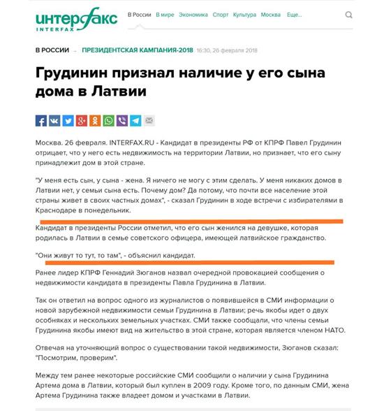 Грудинина на лжи о служившем в Латвии сыне...». В материале говорится: «Бизнесмен