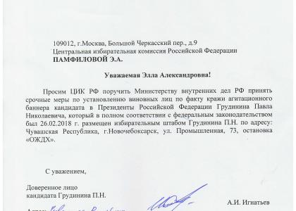 В Новочебоксарске в ночь с 27 на 28 февраля был украден агитационный баннер кандидата в Президенты Российской Федерации Павла Николаевича Грудинина.