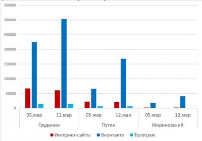 В "старых" опросах Вконтакте (созданных до 01.03 и уже представленных в предыдущих мониторингах) рейтинг Грудинина составляет 68% (суммарно за него проголосовали 241 тысяча человек). В отличии от интернет-сайтов, темы голосований не менялись, так что можно посчитать прирост как в абсолютных показателях (на 16 тысяч голосов), так и в относительных (на 6% за неделю). При этом рейтинг Грудинина вырос на 1%, с 67% до 68%. Активность голосования за Путина несколько выше, чем у кандидата от КПРФ, прирост голосов составил 20 тысяч голосов, правда это никак не повлияло на улучшение результата – в результате рейтинг Путина понизился с 18% до 17%. Рейтинг Жириновского остался на уровне 5%.