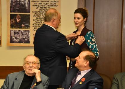 Затем состоялось награждение деятелей культуры памятными медалями ЦК КПРФ «100 лет Великой Октябрьской социалистической революции». Награды вручал Г.А. Зюганов. Среди награжденных актеры Н.Н. Губенко, Ж.А. Болотова, А.Е. Ливанов, Л.В. Зайцева, певцы В.П. Овсянников, Н.Е. Крыгина и другие – это все творческие люди, которые на протяжении многих лет сотрудничают с КПРФ.