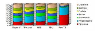Предпочтение В. Жириновскому отдали телеканалы Рен-ТВ и «Россия» (39 и 32%), Г. Явлинскому – НТВ (17%), Б. Титову – НТВ (14%). К. Собчак – «Первый» (14%), С. Бабурину – ТВЦ (14%), М. Сурайкину – ТВЦ и «Первый» (15%) (График 12).