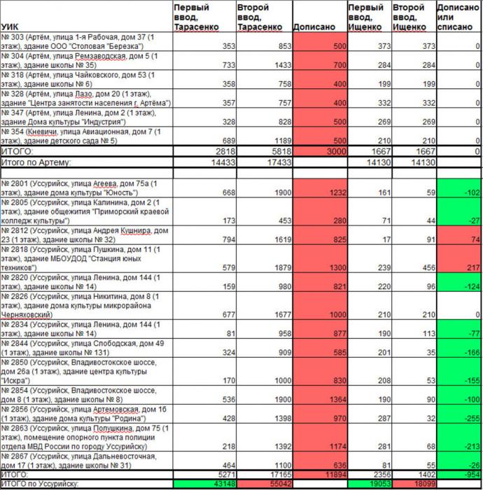 Теризбиркомы Артема и Уссурийска произвели повторный ввод данных в систему ГАС “Выборы” в ночь подсчета голосов, после чего у кандидата в губернаторы Приморья Андрея Тарасенко резко выросли результаты, сообщил VL.ru член Центризбиркома с правом решающего голоса. Он также предоставил соответствующие таблицы, подтверждающие, что на 13 участках в Уссурийске Тарасенко дописали 11 894 голосов, а на шести участках в Артеме и Кневичах - 3000 голосов.