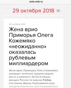 Как известно, свои документы для участия в выборах подал назначенный президентом врио губернатора гр. Кожемяко. Пока он собирает подписи граждан и муниципальных депутатов и граждан (как самовыдвиженец). Интересно бы глянуть его декларацию. Будут ли там указаны те сведения, что приводятся на сайте «Эхо Москвы». Ведь, как оказывается, жена гр.Кожемяко в знаменитом списке «Форбс», где представлены богатейшие женщины России.