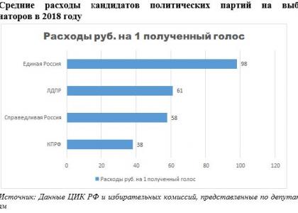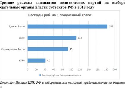 Средние расходы политических партий на выборах депутатов региональных парламентов составили для КПРФ – 41 руб. за голос, для «Справедливой России» - 93 руб./голос, для ЛДПР – 112 руб./голос и для «Единой России» - 183 руб./голос, не считая поддержки «административным ресурсом».
