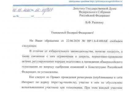 Аналогичный ответ дали Рашкину и на обращение в Мосгоризбирком. В МГИК не согласились с тем, что розыгрыш призов можно счесть подкупом избирателей — на основании того, что само понятие «подкуп» не установлено нормативными актами, которые регламентируют проведение всероссийского голосования по поправкам в Конституцию. Участие в розыгрыше не обусловлено тем выбором, который сделал гражданин пришедший на участок для голосования. Кроме того, от участия каждый мог отказаться. «Таким образом, проведение указанной в Вашем обращении акции не противоречит действующему законодательству, в том числе порядку проведения общероссийского голосования», — сообщили в МГИК. Ответ комиссии за подписью зампреда комиссии Дмитрия Реута также есть у РБК.