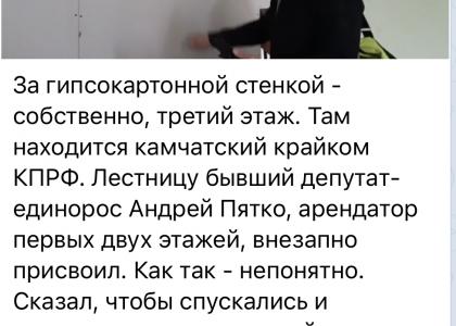 На фото: За гипсокартонной стенкой - собственно, третий этаж. Там находится камчатский крайком КПРФ. Лестницу бывший депутат-единорос Андрей Пятко, арендатор первых двух этажей, внезапно присвоил. Как так - непонятно. Сказал, чтобы спускались и поднимались по пожарной (серьезно, вот без шуток - по фасаду). Всё как-то некстати «совпало» с подачей мунфильтра кандидатом в губернаторы от КПРФ Валерием Быковым. Вот такая «ответочка» прилетела.