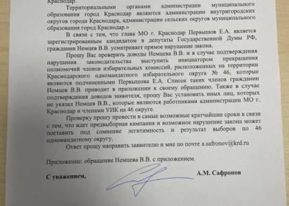 Член территориальной избирательной комиссии (ТИК) Западная Краснодара Виталий Немцев (КПРФ) 10 августа подал жалобу на мэра Евгения Первышова. Он заподозрил его в нарушении федеральных законов при проведении избирательной кампании в Государственную думу.