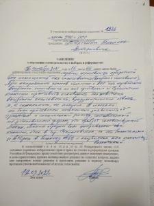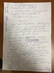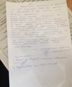 Сегодня, 18 сентября, заявления на надомное голосование привезли в 8:30 утра. При осмотре наблюдателем с ПСГ было обнаружено, что многие заявления были написаны одной рукой. Когда он стал откладывать их в сторону, председатель УИК забрала их и сказала, что теперь ознакомление с заявлениями будет происходить с дистанции 1,5 м и из её рук. Пишется жалоба.