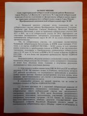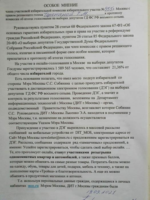 Слелдует отметить, что при подведении итогов голосования по всей вертикали избирательных комиссий подавались особые мнения членов избиркомов с указанием фактов фальсификаций и нарушений законодательства в 205 Преображенском одномандатном округе. Вот пример особого мнения члена избиркома на УИК-955 Т.Н.Трениной.