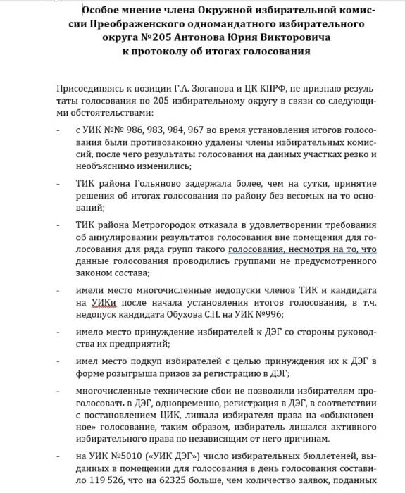 Особое мнение члена Окружной избирательной комиссии Преображенского одномандатного избирательного округа №205 Антонова Юрия Викторовича