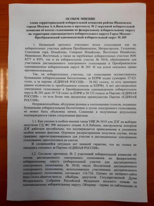 Особое мнение члена Окружной избирательной комиссии Преображенского одномандатного избирательного округа №205 А.А.Васильева к протоколу об итогах голосования