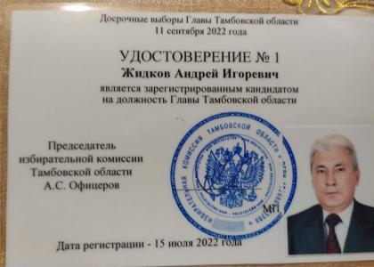2. Выдать Жидкову Андрею Игоревичу удостоверение о регистрации кандидатом на должность Главы Тамбовской области установленной формы», - говорится в постановлении областного избиркома.