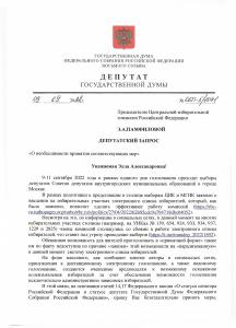 В этой связи, на основании статей 14,17 Федерального закона «О статусе сенатора Российской Федерации и статусе депутата Государственной Думы Федерального Собрания Российской Федерации», прошу Вас безотлагательно принять меры, направленные на восстановление функционирования на избирательных участках города Москвы электронного списка избирателей и обеспечение контроля над отсутствием нарушений в ходе голосования, а также предоставить информацию о причинах подобной «аномалии».