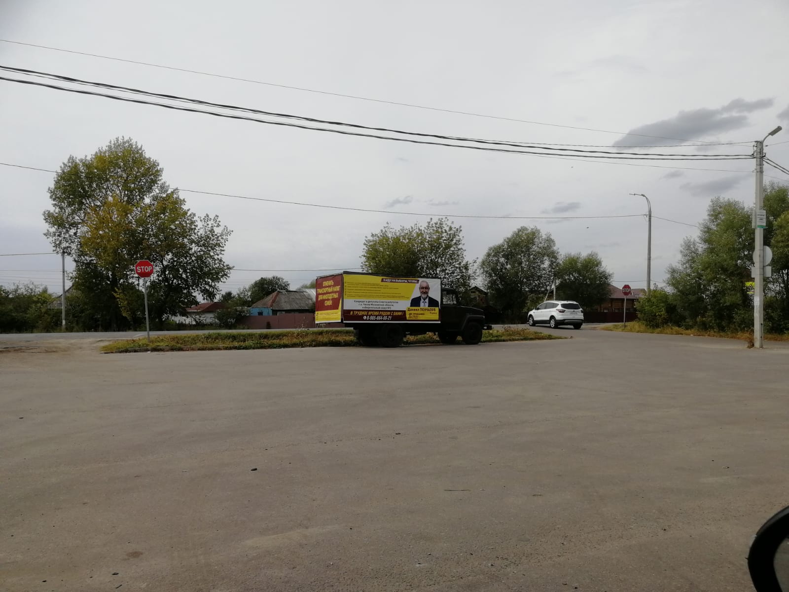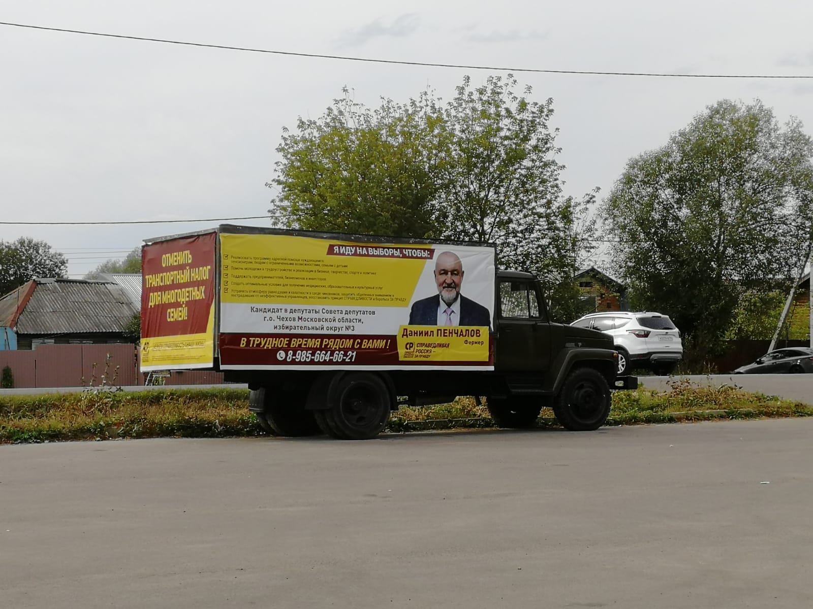 В г. Чехов незаконная агитация СР перед УИКами: А/м Газ обвещенный баннерами кандидата курсирует по территории села Молоди – подана жалоба кандидатом от КПРФ (Балаковым Р.В.) в ИКМО и ТИК.