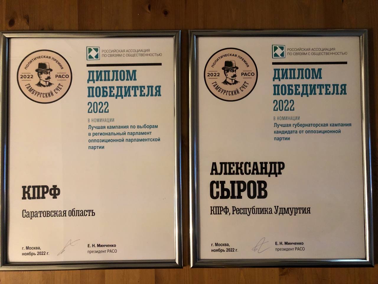 В номинации «Лучшая кампания по выборам в региональный парламент оппозиционной парламентской партии» в этом году по мнению авторитетного и профессионального экспертного сообщества победила избирательная кампания КПРФ в Саратовской области (первый секретарь обкома О.Н.Алимова). Что ж, наши товарищи победили в серьезной конкуренции, и мы их поздравляем с заслуженным успехом.