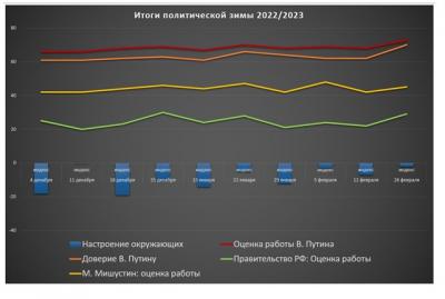При ответе на прямой, закрытый вопрос ВЦИОМ (респонденту предлагают выбрать из указанных фамилий) рейтинги следующие: Путину, как и неделей ранее, выражают доверие 80% опрошенных, Мишустину – 62%, Медведеву – 38% (снижение на 1%), Зюганову – 35% (рост на 1%), Миронову – 31% (снижение на 3%), Слуцкому – 15% (снижение на 2%), Нечаеву – 8% (рост на 2%). С учетом отрицательных оценок рейтинг (индекс) доверия Путину составляет 63%, Мишустина – 44%. У остальных политиков рейтинги отрицательные (не доверяет больше опрошенных, чем доверяет): -6% у Миронова (выше на 3% по сравнению с прошлой неделей), -10% - у Медведева (рост на 6%), -10% - у Нечаева (рост на 2%), -14% - у Зюганова (снижение на 3%), -15% - у Слуцкого (снижение на 3%). По данным же ФОМ рейтинг Путина за неделю снизился – на 20 марта он составляет 77%, с учетом негативных оценок – 64% (67% на прошлой неделе). Однако при этом до определения всех участников президентской кампании ФОМ публикует только данные президента.