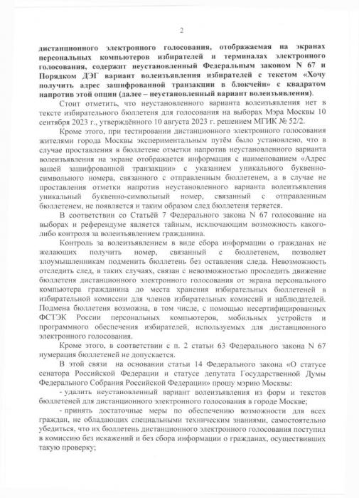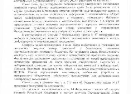 По итогам тестирования московской ДЭГ 25 августа вскрылся вообще неприглядный факт – в бюллетене кроме опций (квадратов для отметки) напротив предложенных к рассмотрению вопросов введен не предусмотренный Федеральным законом N 67 и Порядком ДЭГ еще один неустановленный вариант волеизъявления. А именно после квадратиков для голосования в бюллетене присутствует текст «Хочу получить адрес зашифрованной транзакции в блокчейн» с квадратом напротив этой опции.