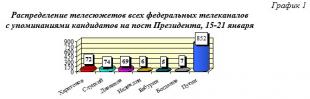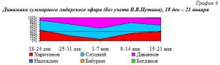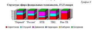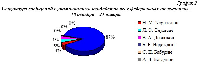 Как видим (гр.2), если анализировать информационную ситуацию с начала заявительно-регистрационной фазы кампании с 18 декабря по 21 января - 87% всех телесюжетов посвящены В.В.Путину, 5% - Л.Э.Слуцкому, и по 4% - Н.М.Харитонову и В.А.Даванкову.