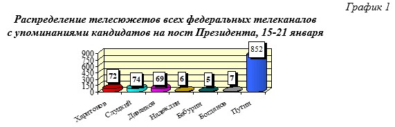 Анализ ситуации в федеральном телеэфире за период с 15 по 21 января показал, что среди соперников В.В.Путина наибольший объем эфира за анализируемые сутки на федеральных каналах получил Н.М.Харитонов– 41% эфира телеэфира без учета В.В.Путина, далее В.А.Даванков – 31% эфира и Л.Э.Слуцкий – 27% (табл. 3, гр. 3).