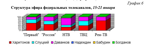 Л. Слуцкому наибольшая доля эфирного времени была предоставлена на ТВЦ (34%), В. Даванкову на НТВ (52%). Б. Надеждин упоминался только на ТВЦ и НТВ (<1%). С. Бабурин был отмечен на «Первом», НТВ и ТВЦ (<1%). А. Богданов чаще всего упоминался на НТВ (7%) (График 6)